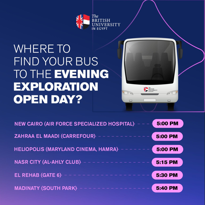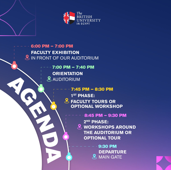 The British University in Egypt is opening its gates on an enchanting evening, where you can explore its breathtaking campus, educate yourself further on your favourite majors through lively and interactive workshops, and experience everything our matchless BUE student life has to offer.