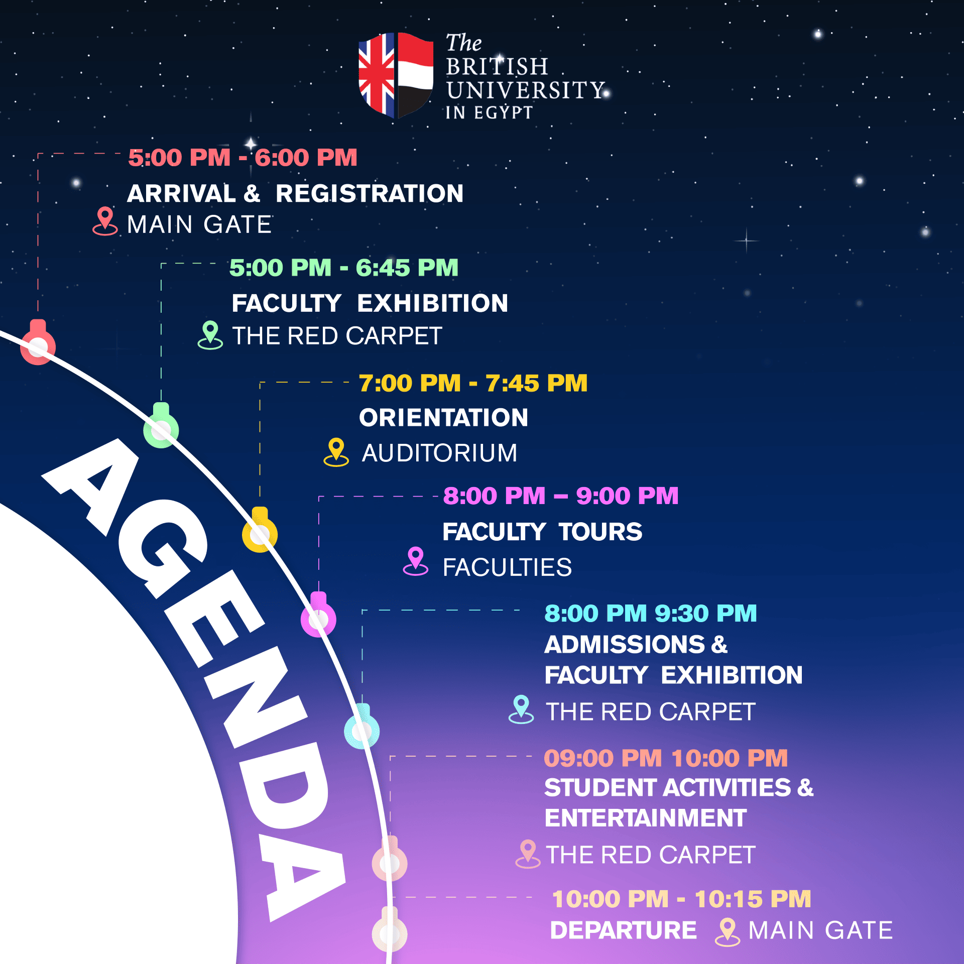 Once again, our University is opening its gates to host the third volume of the extraordinary event, "Under the Stars". We are delighted to draw you a picture of our stunning campus, featuring its lit-up dome and unique architecture, under the dazzling stars of Cairo and surrounded by your future BUE family. The breathtaking view is not all our University has to offer. As you explore our campus, you will learn more about your favourite majors through interactive and fun workshops to get a feel of our distinctive and diverse BUE Student Life.