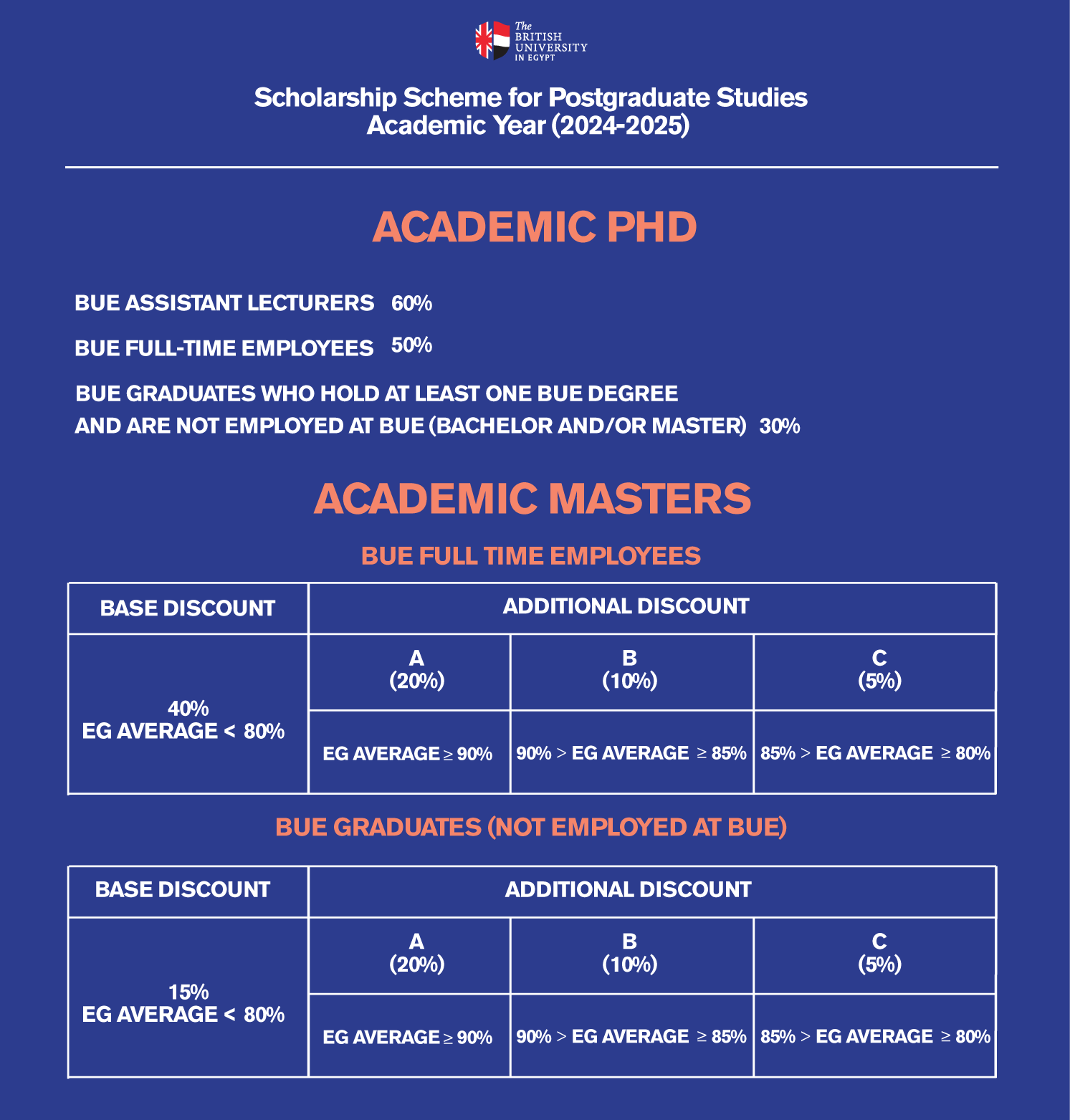 Postgraduate Scholarships will be offered to BUE full-time employees, their families and BUE graduates who wish to pursue studies in the postgraduate programmes as described below.
